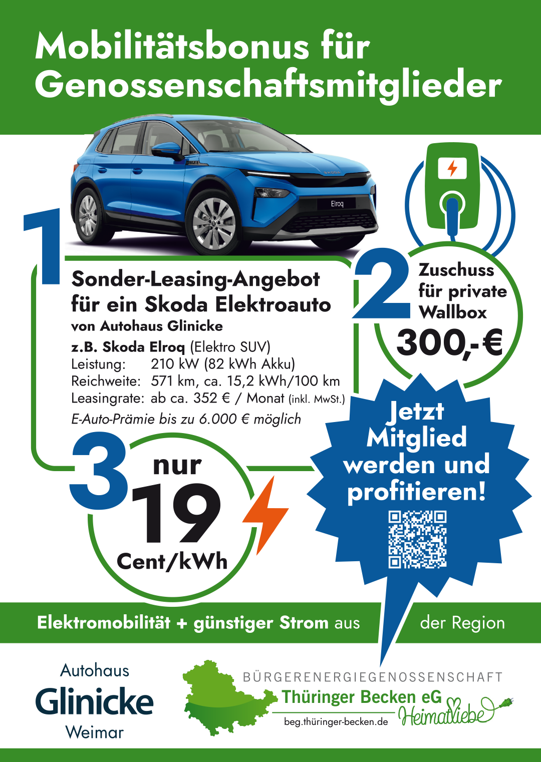 Der Mobilitätsbonus verbindet günstige Elektromobilität mit regionaler Energie. Genossenschaftsmitglieder profitieren von einem Sonder-Leasing-Angebot für ein E-Auto, einem Zuschuss für die private Wallbox und unserem Mitgliederstromtarif. So wird der Umstieg einfacher, planbarer und wirtschaftlich attraktiver.